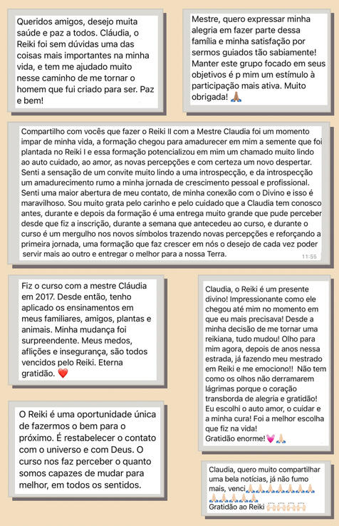 Cláudia Estevam foi iniciada ao Reiki há 21 anos e escolheu se tornar Mestre em 2007. Desde então, ministra cursos de todos os níveis em Belo Horizonte-MG. Já iniciou mais de 600 alunos e pretende continuar com essa missão.